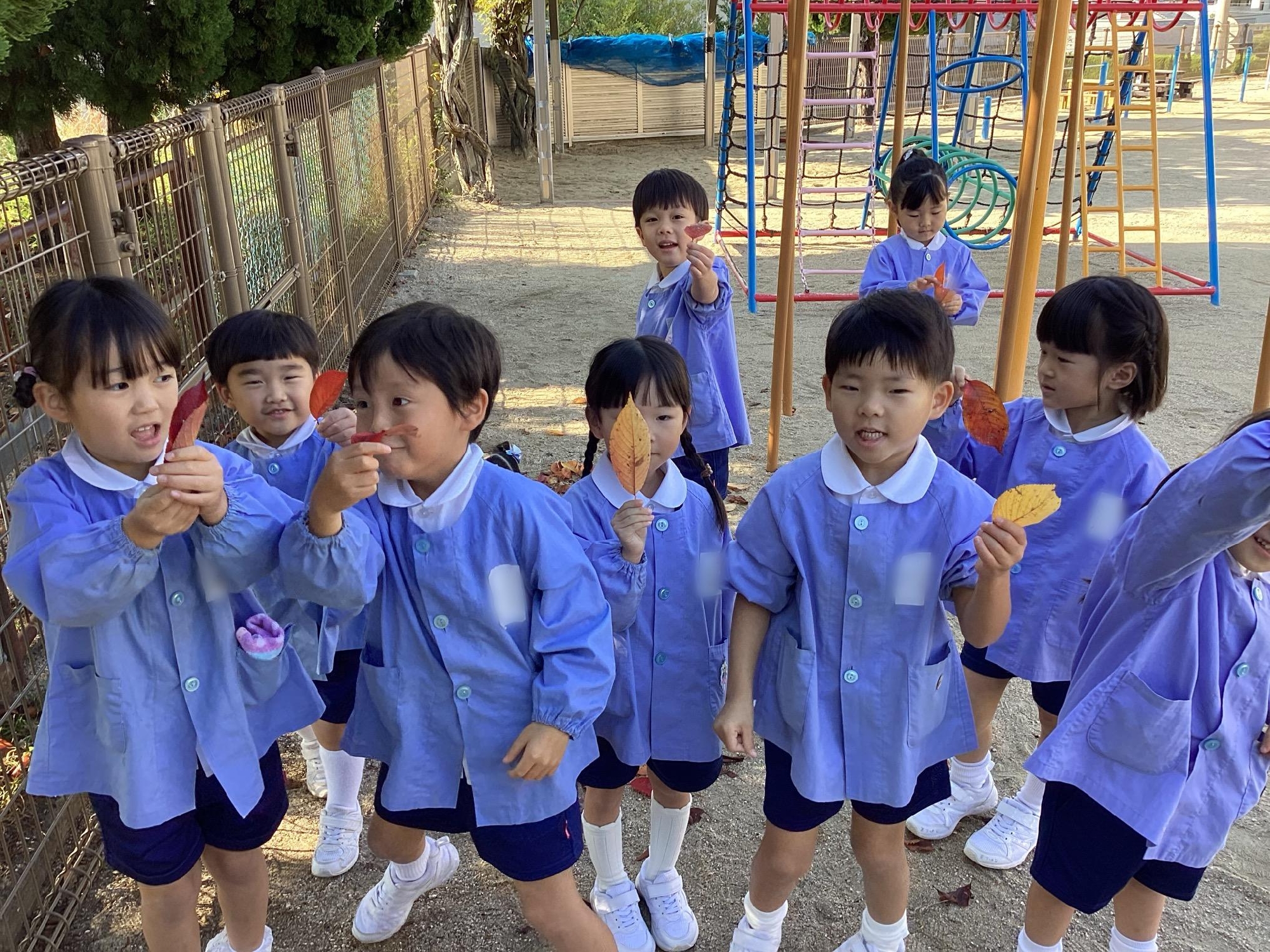 赤色や黄色、オレンジ色など秋の季節ならではの葉っぱを見つけた子どもたち🍂