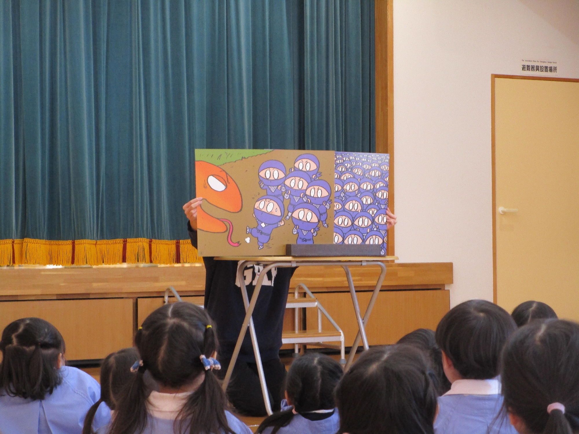 先生からのお楽しみは、大型紙芝居「まんまるまんま たんたかたん」でした。